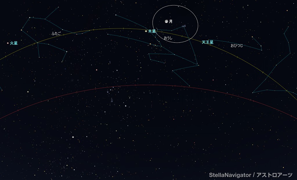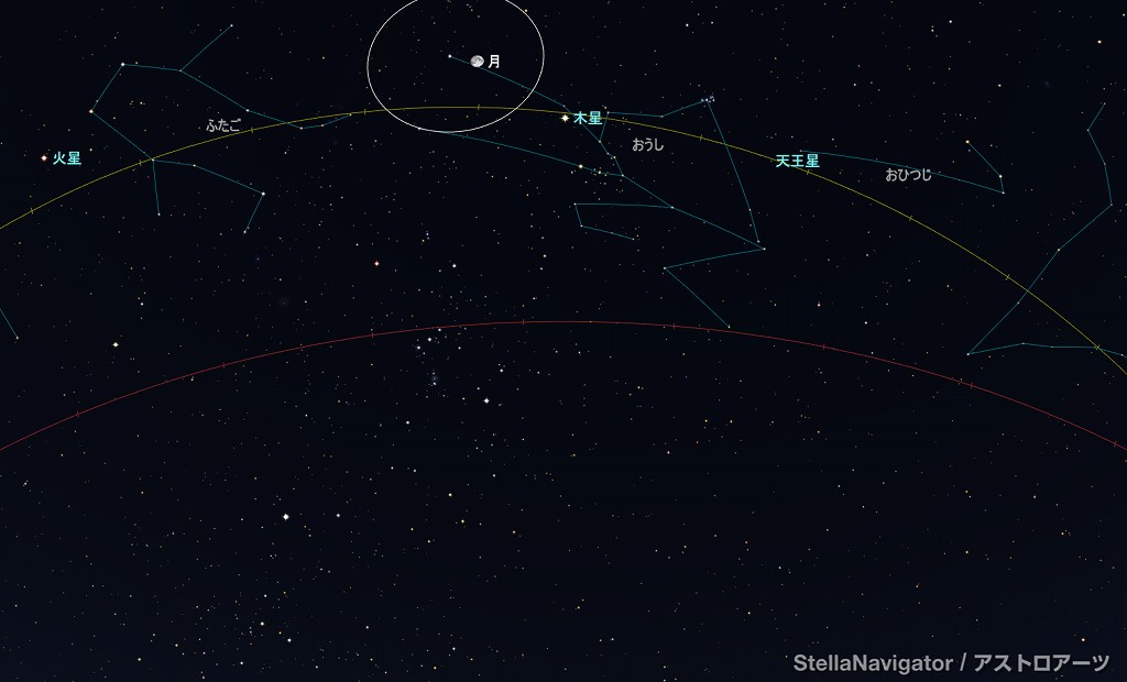 ![]() 2025年1月10日21時ごろの南の空。 黄線:黄道、赤線:天の赤道 (月齢10.6) ![]() 月とすばる(プレアデス星団) (視野円7度) ![]() 2025年1月11日21時ごろの南の空。 黄線:黄道、赤線:天の赤道 (月齢11.6) ![]() 月とエルナト (視野円7度) |