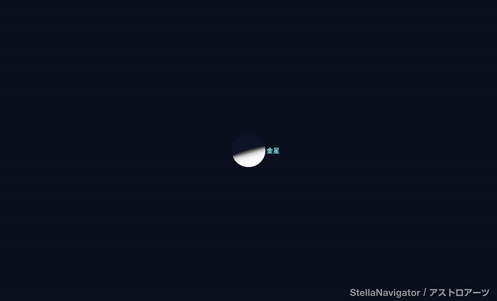 ![]() 2025年1月10日、日没1時間後ごろの南西の空。 金星が東方最大離角。 ![]() 金星を望遠鏡で見ると、 上弦の半月のように見えます。 |