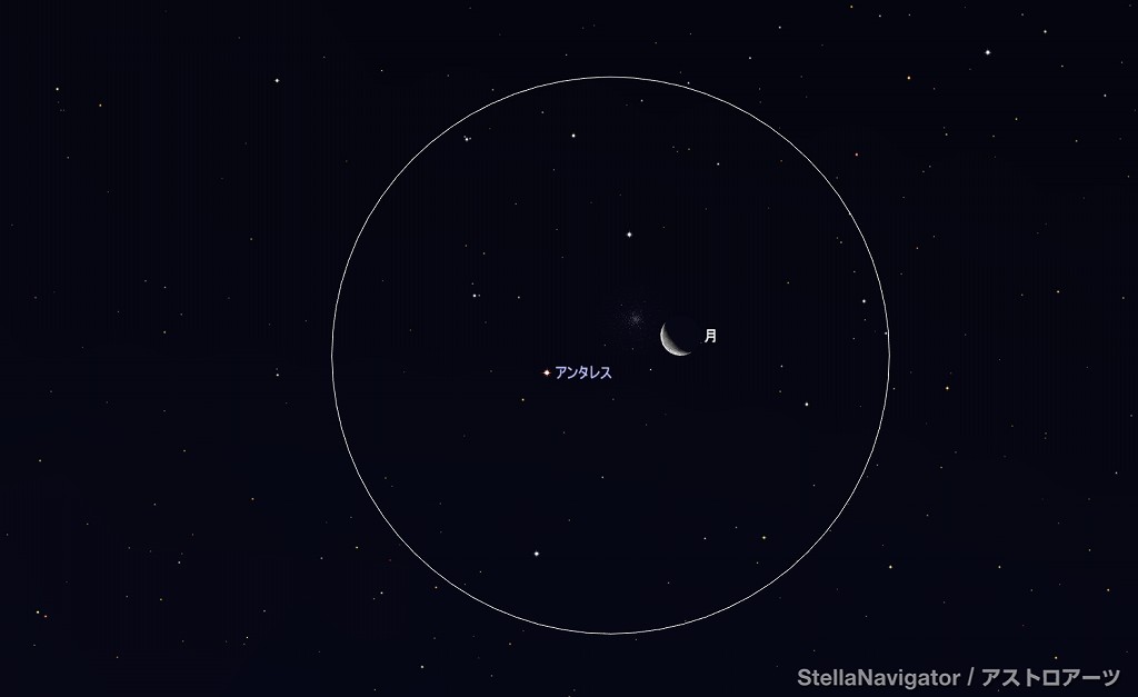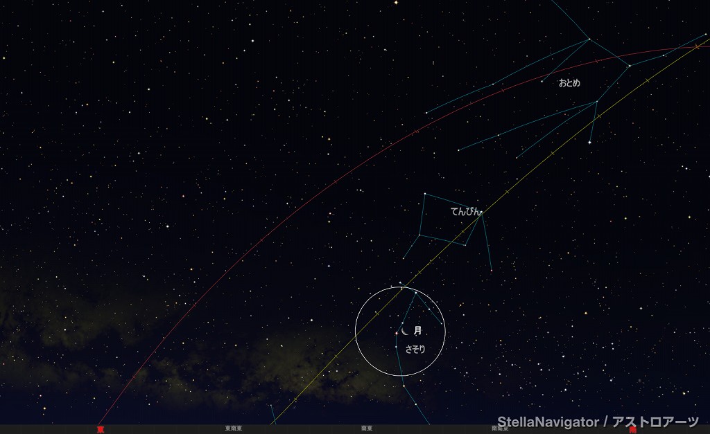 ![]() 2025年1月21日未明3時ごろの南東の空。 黄線:黄道、赤線:天の赤道 (月齢20.8) ![]() 月とスピカ (視野円7度) ![]() 2025年1月25日早朝5時ごろの南東の空。 黄線:黄道、赤線:天の赤道 (月齢24.9) ![]() 逆三日月とアンタレス (視野円7度) |