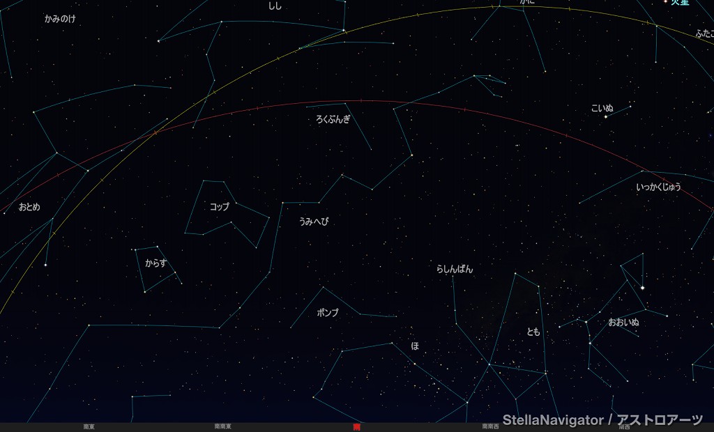 ![]() 2025年2月の星空の様子 (黄線:黄道、赤線:天の赤道) 南の空 上旬21時ごろ 中旬20時ごろ 下旬19時ごろ (以下、同様) ![]() 南〜天頂 ![]() 東の空 ![]() 北の空 ![]() 西の空 ![]() 星座早見 (南が下) ![]() 2025年2月の星空の様子 (黄線:黄道、赤線:天の赤道) 南の空 上旬1時ごろ 中旬0時ごろ 下旬23時ごろ (以下、同様) ![]() 南〜天頂 ![]() 東の空 ![]() 北の空 ![]() 西の空 ![]() 星座早見 (南が下) |