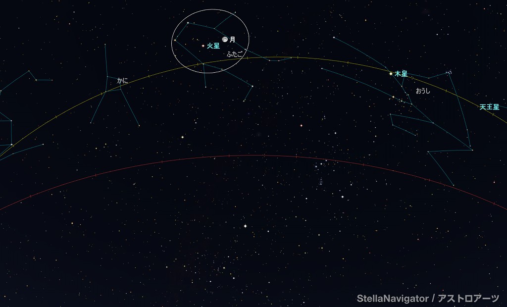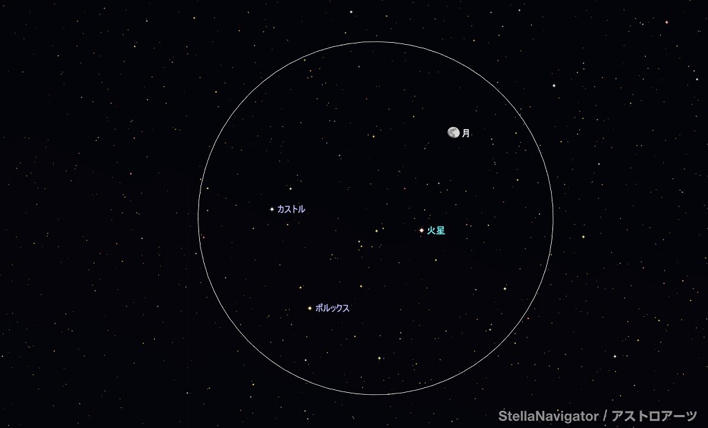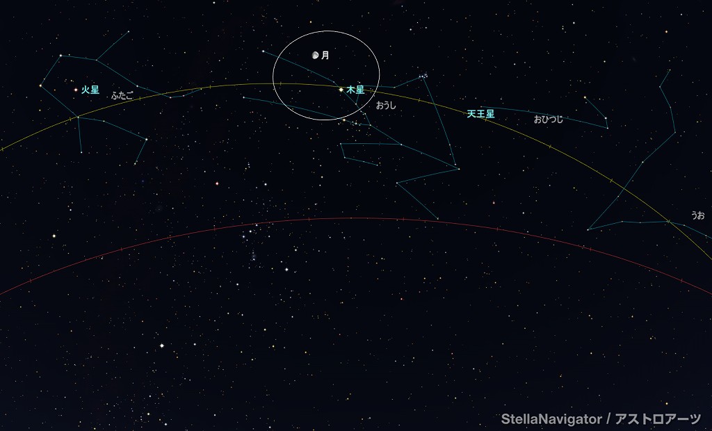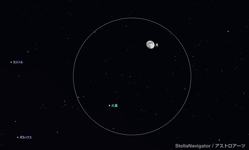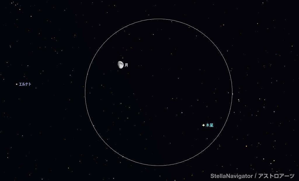 ![]() 2025年2月7日19時ごろの南の空。 黄線:黄道、赤線:天の赤道 (月齢8.9) ![]() 月と木星 (視野円10度) ![]() 月とエルナト(1.6等級) (視野円10度) ![]() 2025年2月9日21時ごろの南の空。 黄線:黄道、赤線:天の赤道 (月齢11.0) ![]() 月と火星 (視野円7度) ![]() 月、火星、ポルックス、カストル (視野円15度) |
