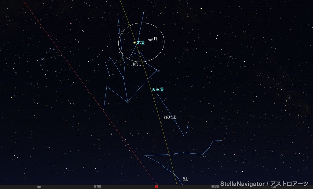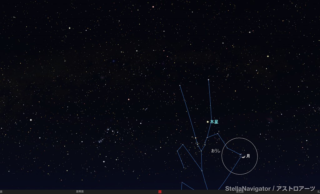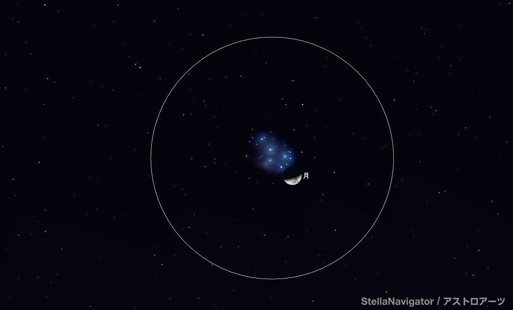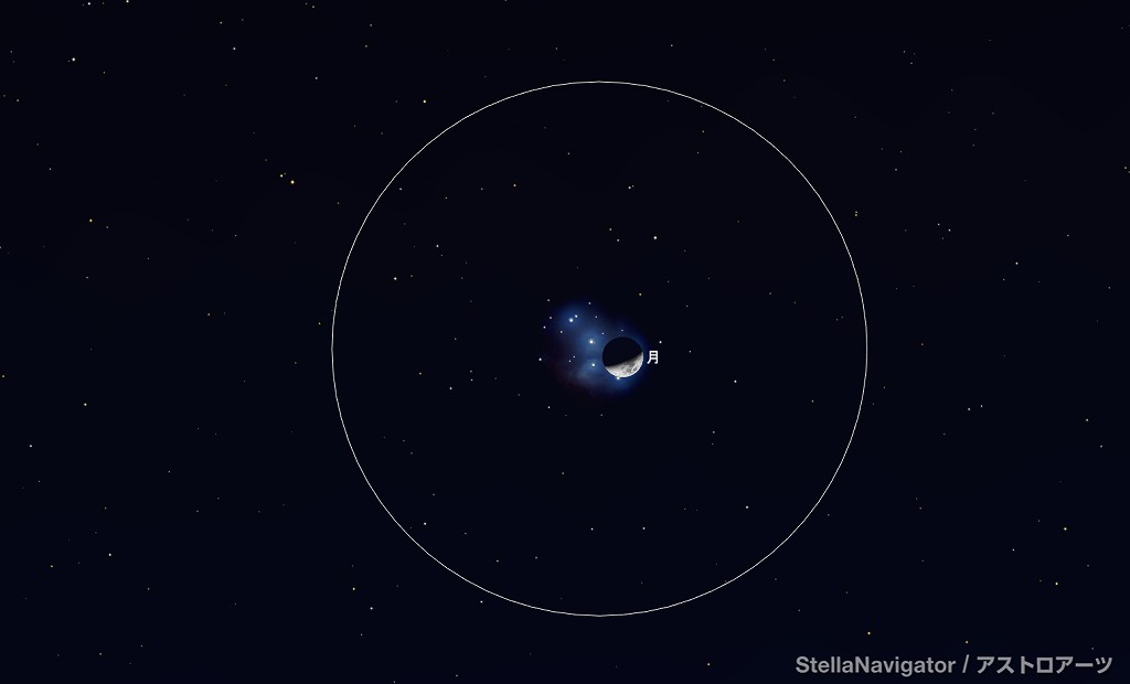 ![]() ![]() すばる食(プレアデス星団食) 2025年3月5日22時ごろの西の空。 月の高さは約20度。 ![]() ![]() すばる食(プレアデス星団食) 2025年3月5日23時ごろの西の空。 月の高さは約10度。 |