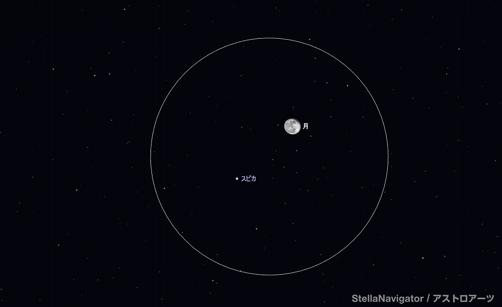 ![]() 2025年3月12日22時ごろの南の空。 黄線:黄道、赤線:天の赤道 (月齢12.5) ![]() 月とレグルス (視野円7度) ![]() 2025年3月16日23時ごろの南東の空。 黄線:黄道、赤線:天の赤道 (月齢16.6) ![]() 月とスピカ (視野円7度) |