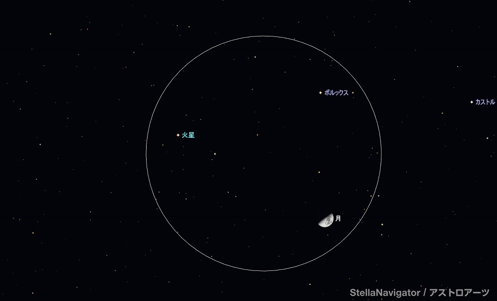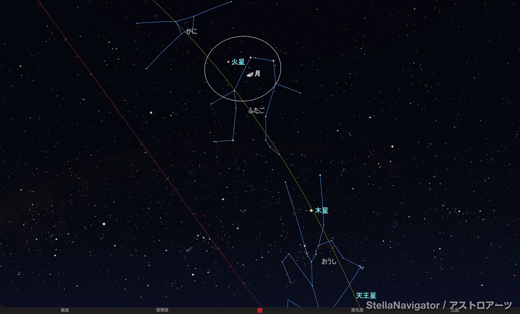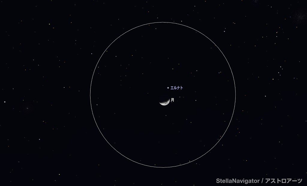 ![]() 2025年4月3日20時ごろの西の空。 黄線:黄道、赤線:天の赤道 (月齢5.0) ![]() 月とエルナト (視野円7度) ![]() 那覇では「エルナト食」となります。 潜入:20時33分ごろ。 ![]() 出現:21時10分ごろ ![]() 2025年4月5日21時ごろの西の空。 黄線:黄道、赤線:天の赤道 (月齢7.0) ![]() 月、火星、ポルックス (視野円7度) |