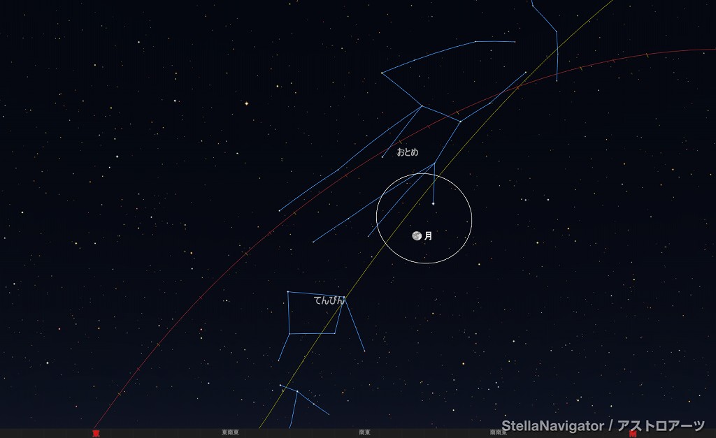![]() 2025年4月8日21時ごろの南の空。 黄線:黄道、赤線:天の赤道 (月齢10.0) ![]() 月とレグルス (視野円7度) ![]() 2025年4月13日22時ごろの南東の空。 黄線:黄道、赤線:天の赤道 (月齢15.1) ![]() 満月とスピカ (視野円7度) |