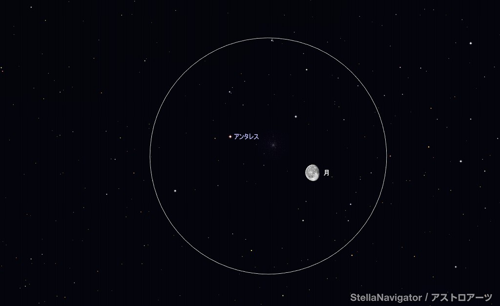 ![]() 2025年4月17日未明3時ごろの南の空。 黄線:黄道、赤線:天の赤道 (月齢18.3) ![]() 月とアンタレス (視野円7度) |