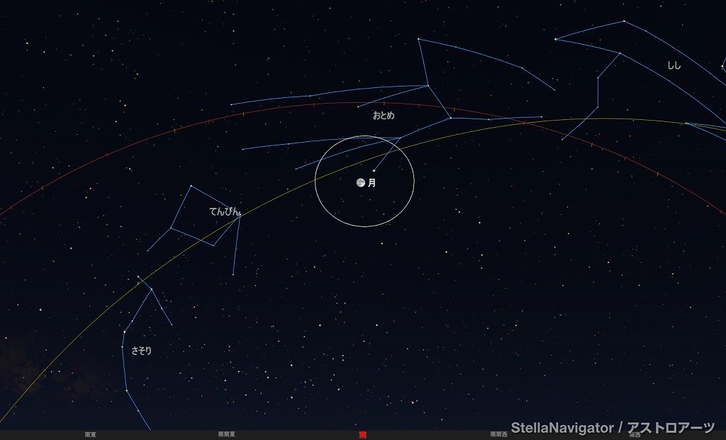 ![]() 2025年5月5日20時ごろの南の空。 黄線:黄道、赤線:天の赤道 (月齢7.6) ![]() 上弦の半月とレグルス (視野円7度) ![]() 2025年5月10日22時ごろの南の空。 黄線:黄道、赤線:天の赤道 (月齢12.7) ![]() 月とスピカ (視野円7度) |