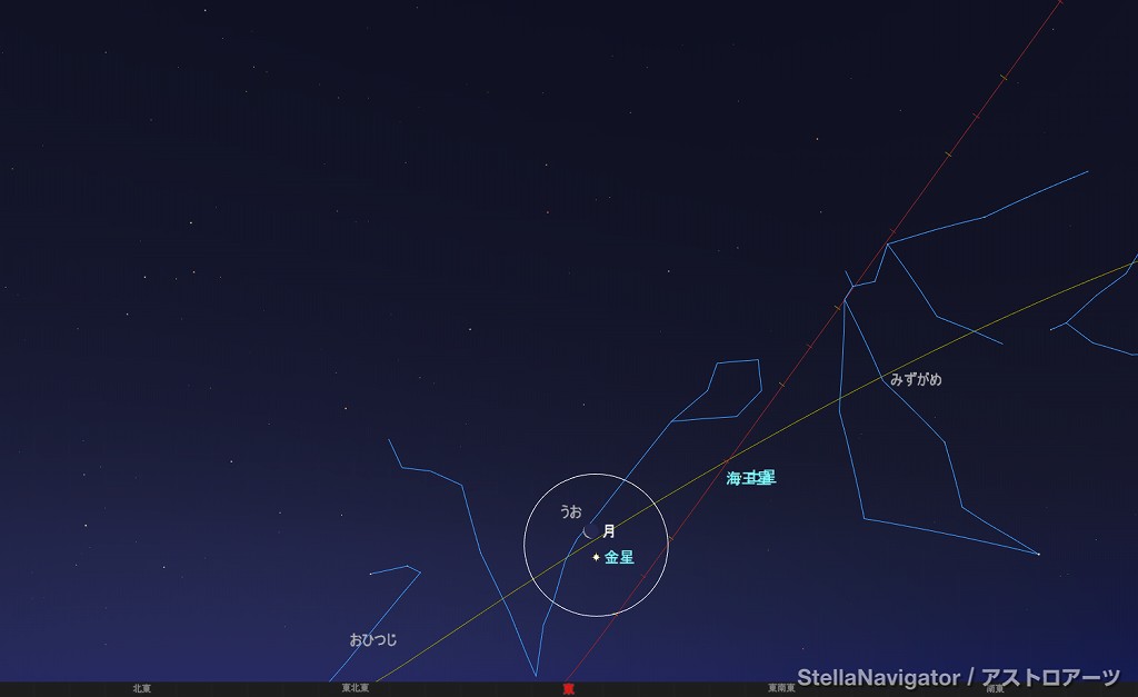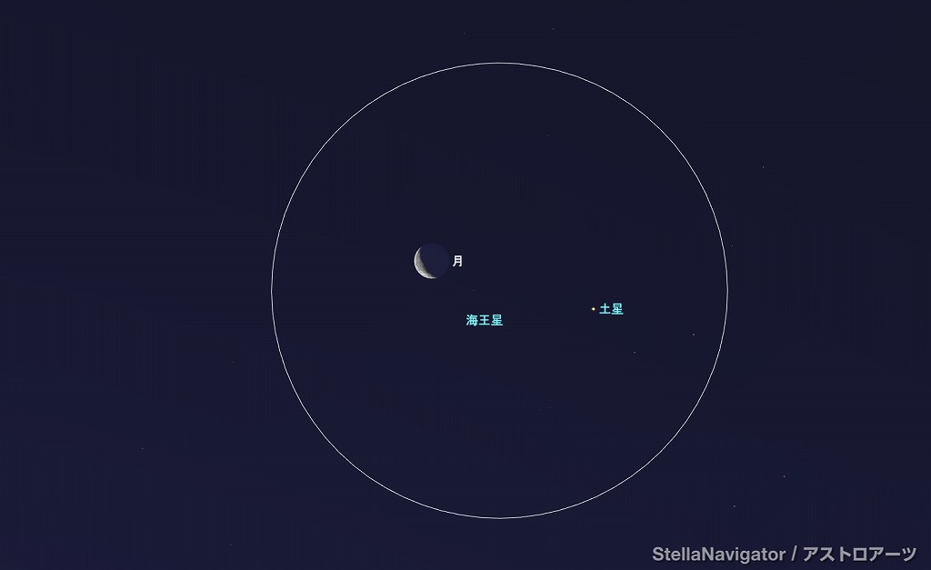 ![]() 2025年5月23日、日の出1時間前ごろの東の空。 黄線:黄道、赤線:天の赤道 (月齢25.0) ![]() 月、土星、海王星 (視野円7度) ![]() 2025年5月24日、日の出1時間前ごろの東の空。 黄線:黄道、赤線:天の赤道 (月齢26.0) ![]() 逆三日月と明けの明星=金星 (視野円7度) |
