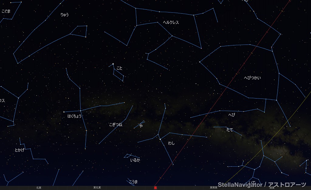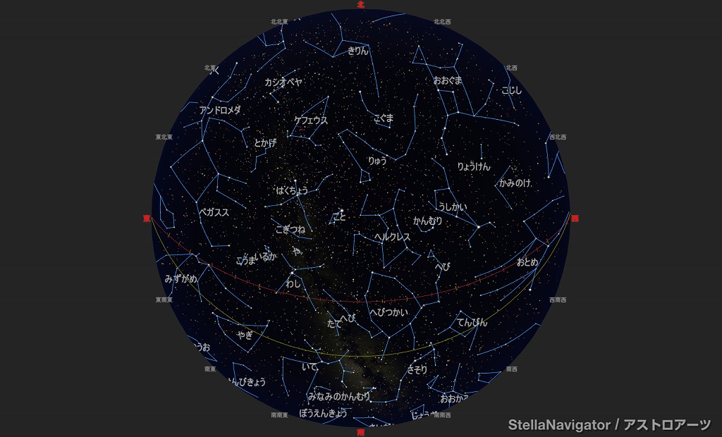 ![]() 2025年6月の星空の様子 (黄線:黄道、赤線:天の赤道) 南の空 上旬22時ごろ 中旬21時ごろ 下旬20時ごろ (以下、同様) ![]() 南〜天頂 ![]() 東の空 ![]() 北の空 ![]() 西の空 ![]() 星座早見 (南が下) ![]() 2025年6月の星空の様子 (黄線:黄道、赤線:天の赤道) 南の空 上旬1時ごろ 中旬0時ごろ 下旬23時ごろ (以下、同様) ![]() 南〜天頂 ![]() 東の空 ![]() 北の空 ![]() 西の空 ![]() 星座早見 (南が下) |