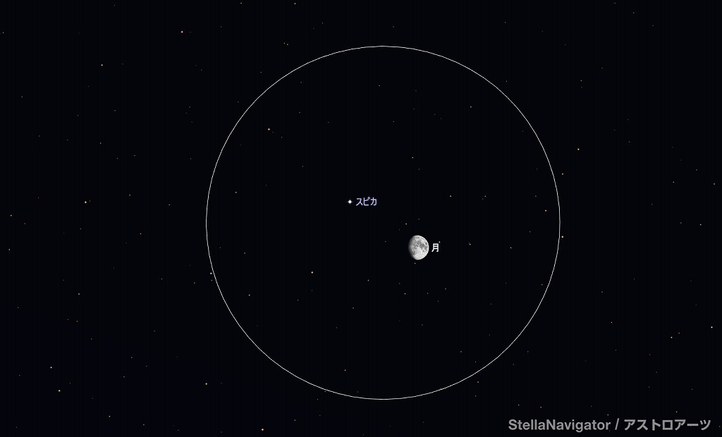 ![]() 2025年6月2日21時ごろの西の空。 黄線:黄道、赤線:天の赤道 (月齢6.4) ![]() 上弦の半月とレグルス (視野円7度) ![]() 2025年6月6日21時ごろの西の空。 黄線:黄道、赤線:天の赤道 (月齢10.4) ![]() 月とスピカ (視野円7度) |