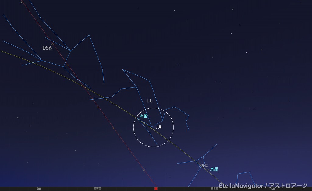 ![]() 2025年6月29日20時ごろの西の空。 黄線:黄道、赤線:天の赤道 (月齢4.0) ![]() 三日月とレグルス (視野円7度) |