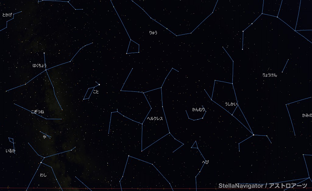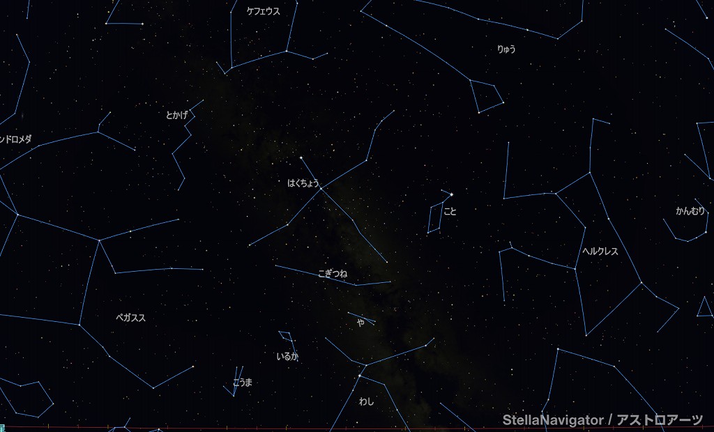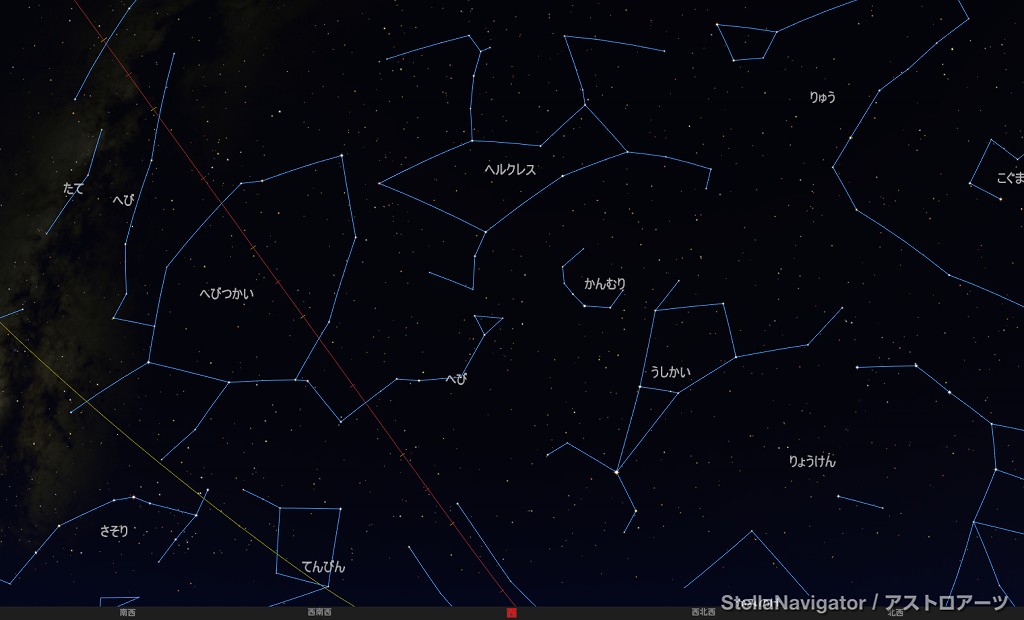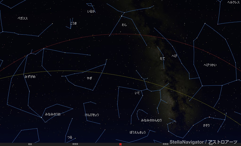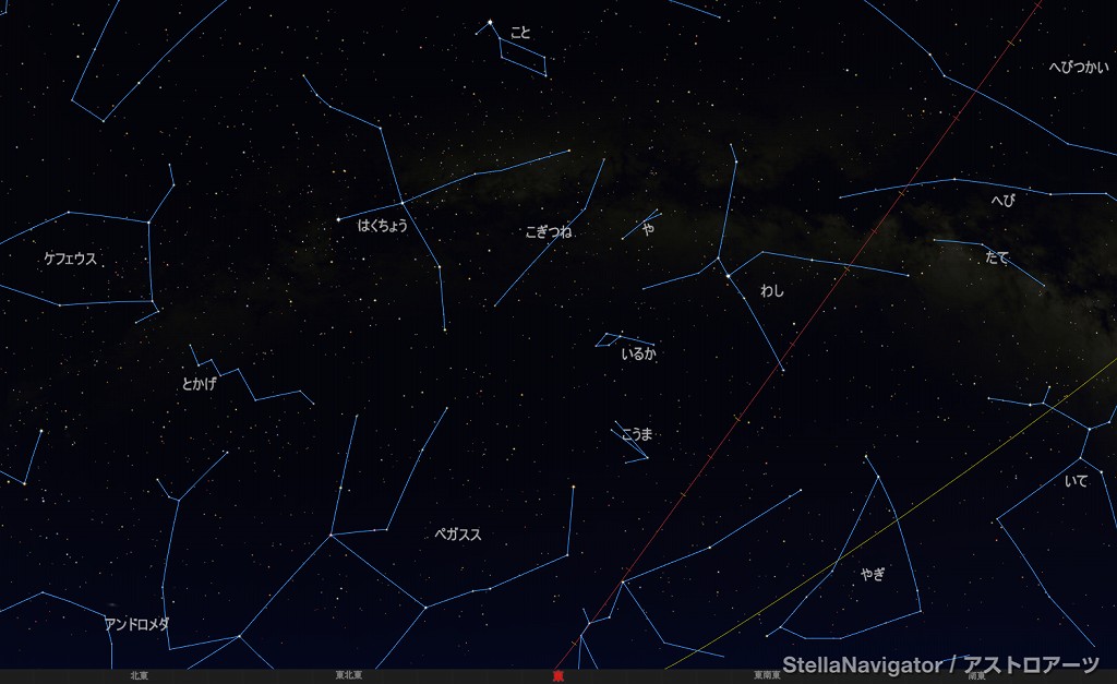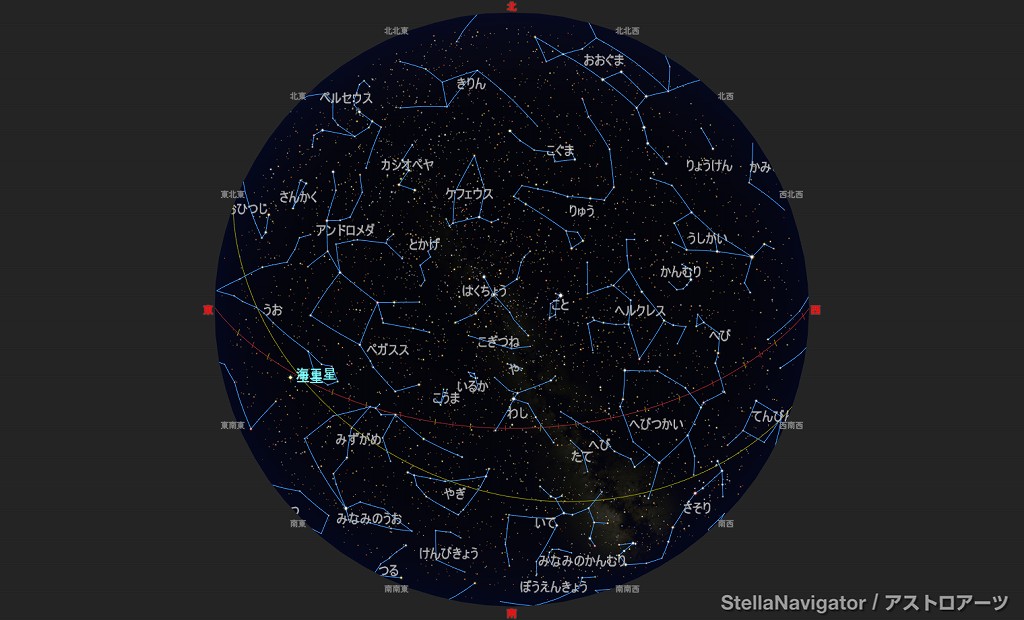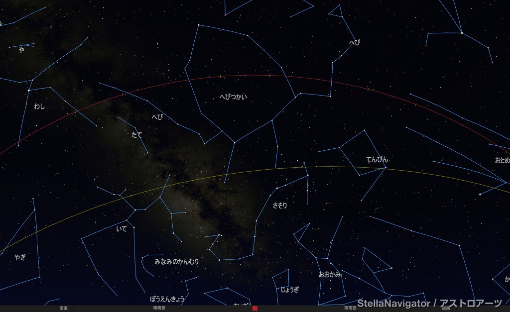 ![]() 2025年7月の星空の様子 (黄線:黄道、赤線:天の赤道) 南の空 上旬22時ごろ 中旬21時ごろ 下旬20時ごろ (以下、同様) ![]() 南〜天頂 ![]() 東の空 ![]() 北の空 ![]() 西の空 ![]() 星座早見 (南が下) ![]() 2025年7月の星空の様子 (黄線:黄道、赤線:天の赤道) 南の空 上旬1時ごろ 中旬0時ごろ 下旬23時ごろ (以下、同様) ![]() 南〜天頂 ![]() 東の空 ![]() 北の空 ![]() 西の空 ![]() 星座早見 (南が下) |