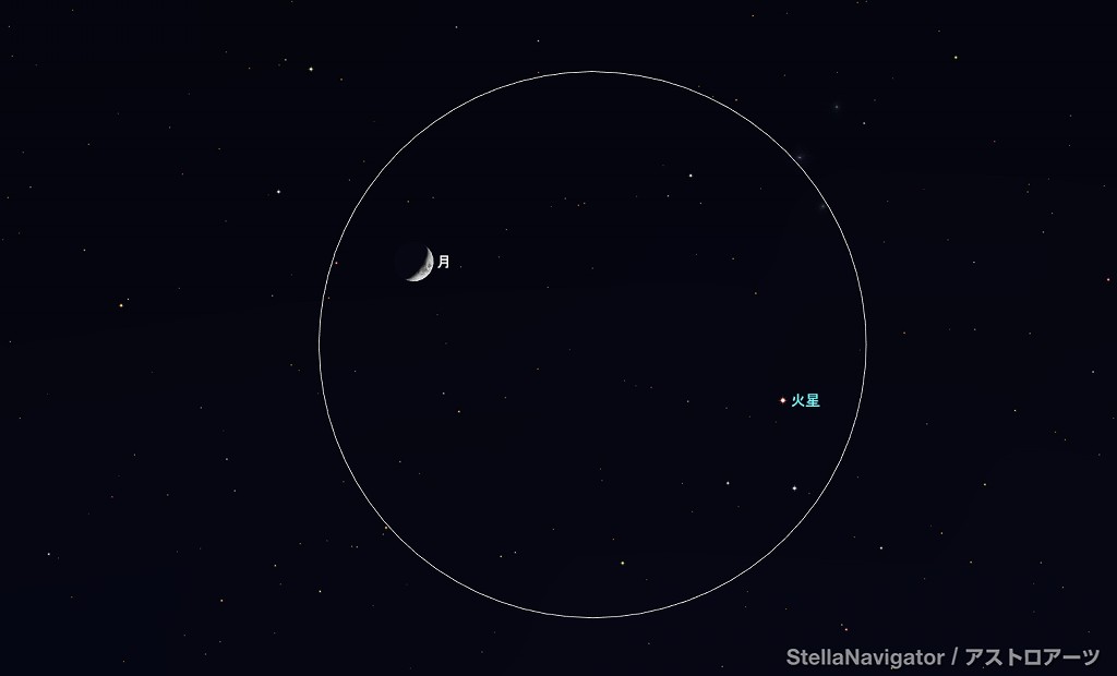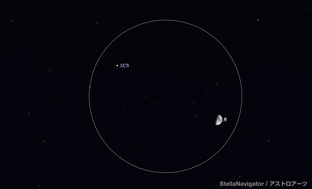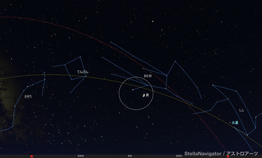 ![]() 2025年6月30日21時ごろの西の空。 黄線:黄道、赤線:天の赤道 (月齢5.1) ![]() 月と火星 (視野円7度) ![]() 2025年7月3日21時ごろの南西の空。 黄線:黄道、赤線:天の赤道 (月齢8.1) ![]() 上弦の半月とスピカ (視野円7度) |
