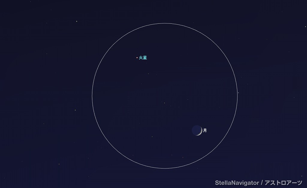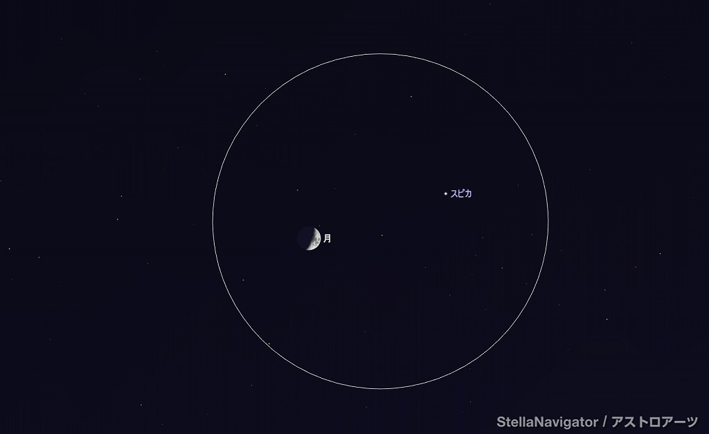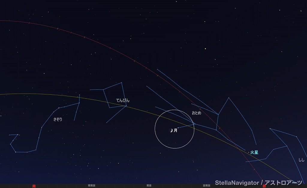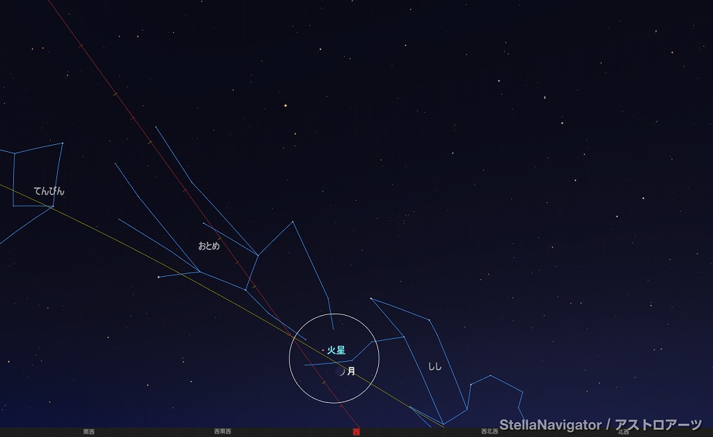 ![]() 2025年7月28日20時ごろの西の空。 黄線:黄道、赤線:天の赤道 (月齢3.7) ![]() 三日月と火星 (視野円7度) ![]() 2025年7月31日20時ごろの南西の空。 黄線:黄道、赤線:天の赤道 (月齢6.7) ![]() 月とスピカ (視野円7度) |