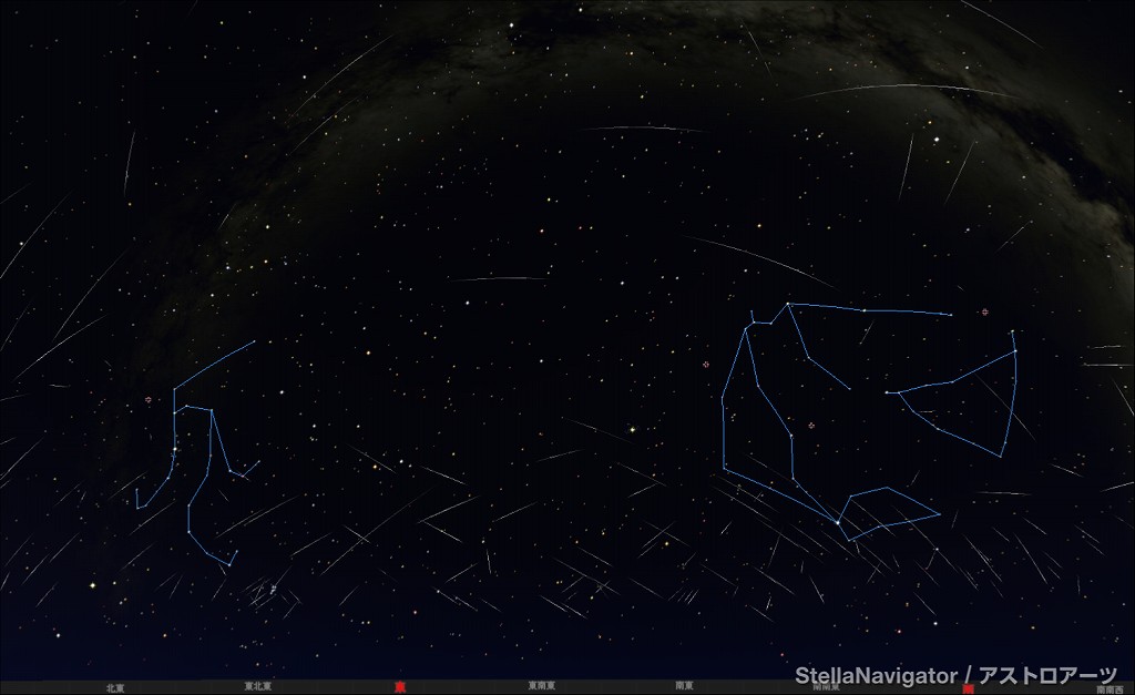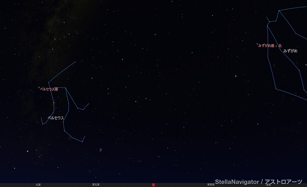 ![]() 7月下旬1〜2時ごろの南の空。 7月下旬から8月上旬には、 みずがめ座δ(デルタ)流星群(南群) みずがめ座ι(イオタ)流星群(北群) やぎ座α(アルファ)流星群が活動中。 ![]() 東の空には、ペルセウス座も昇っています。 お盆のころにピークとなるペルセウス座流星群も、 活動は始まっています。 ![]() (あくまでもイメージです。) |