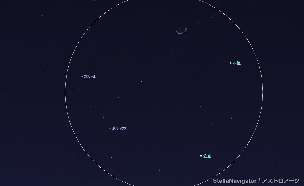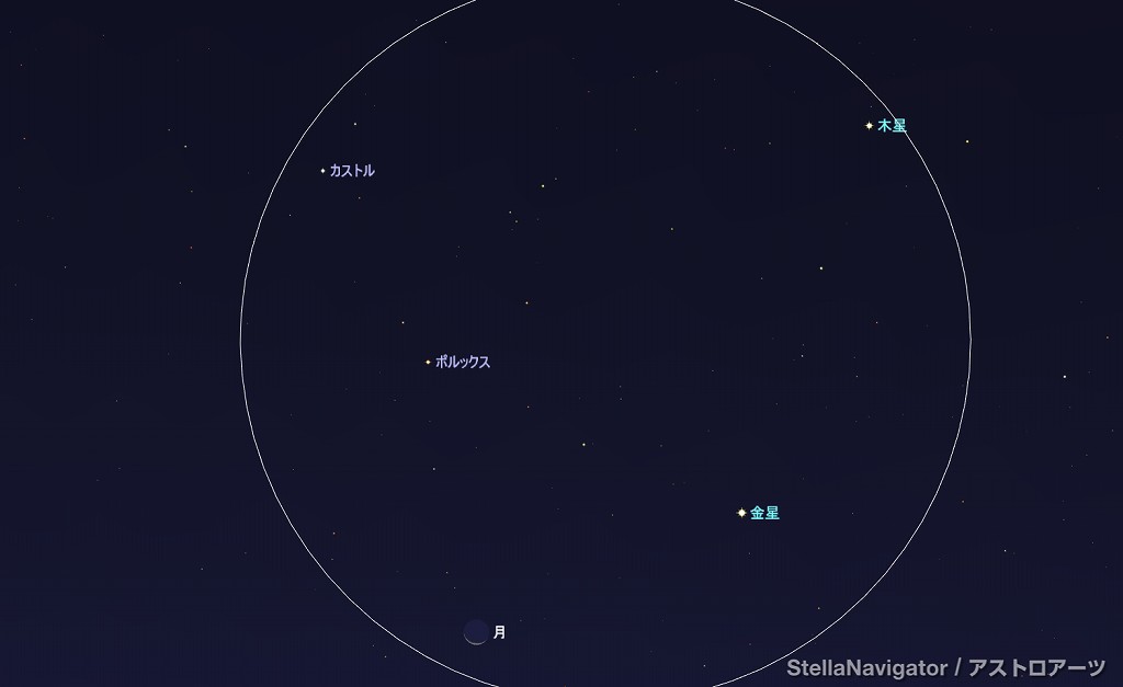![]() 2025年8月20日早朝4時ごろの南東の空。 黄線:黄道、赤線:天の赤道 (月齢26.0) ![]() 月と木星 (視野円7度) ![]() 月、金星、木星、ポルックス、カストル (視野円15度) ![]() 2025年8月21日早朝4時ごろの南東の空。 黄線:黄道、赤線:天の赤道 (月齢27.0) ![]() 月と金星 (視野円7度) ![]() 月、金星、木星、ポルックス、カストル (視野円15度) |