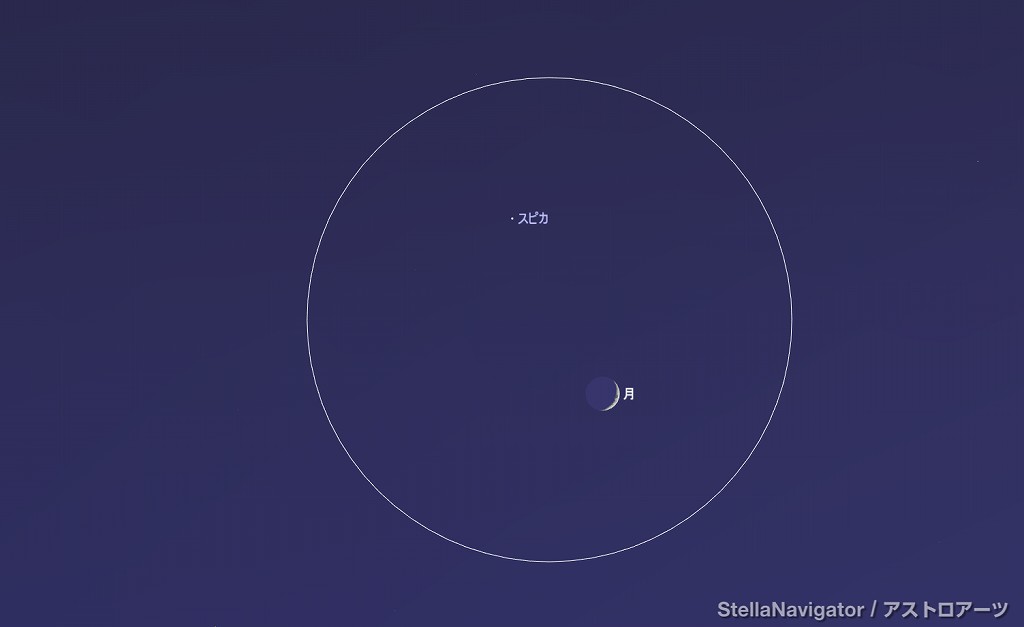 ![]() 2025年8月26日日没1時間後ごろの西の空。 黄線:黄道、赤線:天の赤道 (月齢3.2) ![]() 細い月と火星 (視野円7度) ![]() 2025年8月27日日没1時間後ごろの西の空。 黄線:黄道、赤線:天の赤道 (月齢4.2) ![]() 三日月とスピカ (視野円7度) ![]() 2025年8月31日20時ごろの南西の空。 黄線:黄道、赤線:天の赤道 (月齢8.2) ![]() 上弦の半月とアンタレス (視野円7度) |