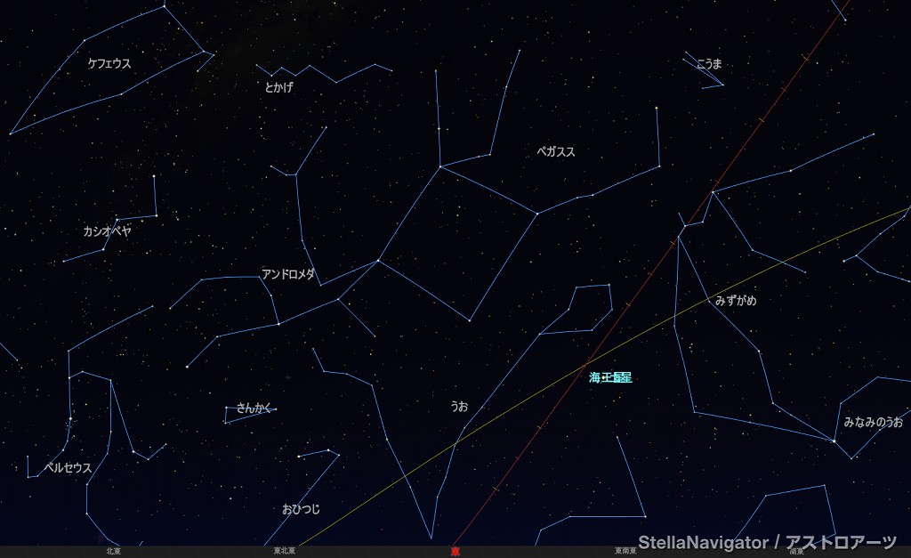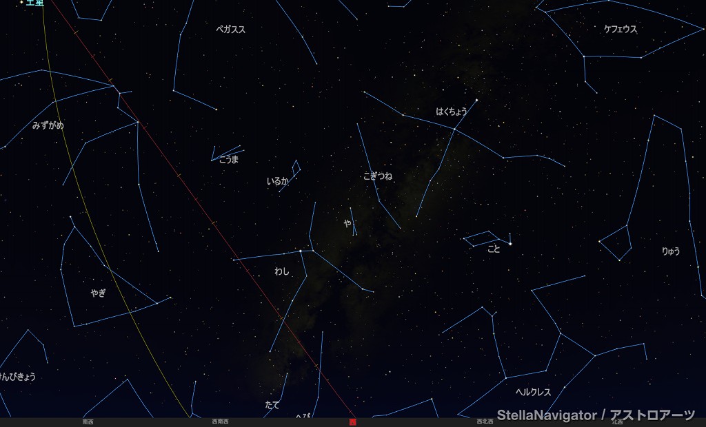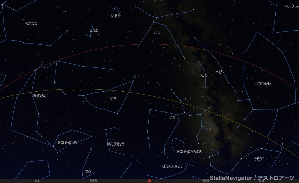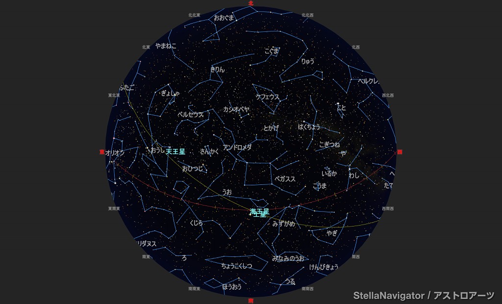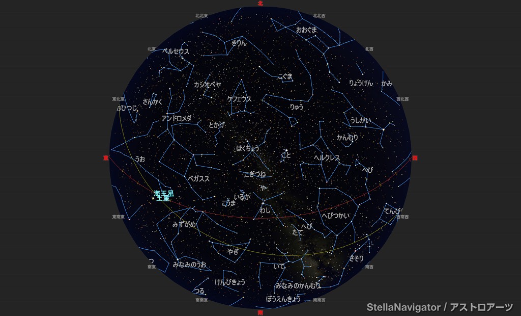 ![]() 2025年9月の星空の様子 (黄線:黄道、赤線:天の赤道) 南の空 上旬21時ごろ 中旬20時ごろ 下旬19時ごろ (以下、同様) ![]() 南〜天頂 ![]() 東の空 ![]() 北の空 ![]() 西の空 ![]() 星座早見 (南が下) ![]() 2025年9月の星空の様子 (黄線:黄道、赤線:天の赤道) 南の空 上旬1時ごろ 中旬0時ごろ 下旬23時ごろ (以下、同様) ![]() 南〜天頂 ![]() 東の空 ![]() 北の空 ![]() 西の空 ![]() 星座早見 (南が下) |