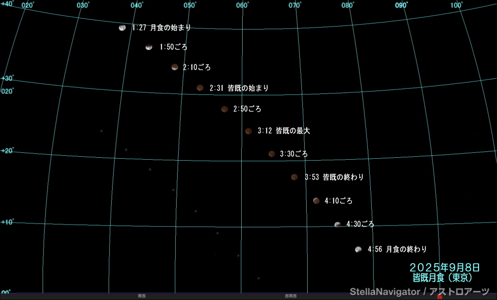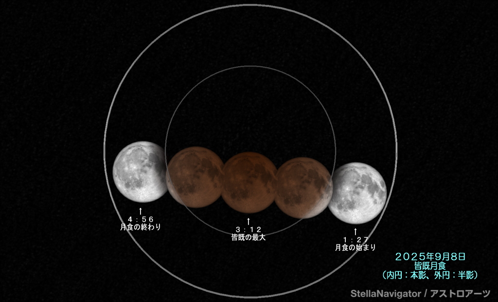| ★彡〜☆彡〜★彡〜☆彡〜★彡〜☆彡〜★彡〜☆彡〜★彡〜☆彡〜★彡〜☆彡 今宵はどんな星空が見えるでしょう。。。 ☆彡 流 れ 星 か ら の 贈 り 物 ★彡 第1036号 2025年9月1日発行 ☆彡〜★彡〜☆彡〜★彡〜☆彡〜★彡〜☆彡〜★彡〜☆彡〜★彡〜☆彡〜★彡 こんにちは。 「流れ星」の鈴木です。 ご愛読いただいている皆さま、 新しく読者登録していただいた方、 本当にありがとうございます。 それでは、今週もよろしくお願いします☆彡 ★彡〜☆彡〜★彡〜☆彡〜★彡〜☆彡〜★彡〜☆彡〜★彡〜☆彡〜★彡〜☆彡 ★今週の話題 ☆彡〜★彡〜☆彡〜★彡〜☆彡〜★彡〜☆彡〜★彡〜☆彡〜★彡〜☆彡〜★彡 ★1.長月9月の主な天文現象 ★2.7日深夜〜8日早朝!皆既月食! ★3.編集後記 ★彡〜☆彡〜★彡〜☆彡〜★彡〜☆彡〜★彡〜☆彡〜★彡〜☆彡〜★彡〜☆彡 ★1.長月9月の主な天文現象 ☆彡〜★彡〜☆彡〜★彡〜☆彡〜★彡〜☆彡〜★彡〜☆彡〜★彡〜☆彡〜★彡 夏から秋へ、 空気が徐々に変わってくるのが9月。 星空も夏から秋へ バトンタッチ体制に入っています。 それでは、 9月の天文現象をチェックしてみましょう。 ★ 1日 金星とプレセペ星団が最接近 ( 8日 月が満月 3時9分) ★ 8日 皆既月食(未明) ★ 8日 月が土星と並ぶ ★13日 月がすばると並ぶ(深夜) (14日 月が下弦 19時33分) ★17日 月がポルックスと並ぶ ★20日 金星とレグルスが超接近(早朝) ★20日 細い月が金星と並ぶ(早朝) (22日 月が新月 4時54分) ★22日 土星が衝 観望シーズンへ ★23日 秋分 ★24日 海王星が衝 ★27日 月がアンタレスと並ぶ(日没後) (30日 月が上弦 8時54分) 7日深夜(8日未明)、皆既月食があります。 詳細については次のトピックでご案内します。 土星が観望シーズンに入っていきます。 9月の星空の様子はコチラ。 http://nagarebosi-kirari.com/mailmaga3/20250901.html#01 【関連トピック】 手の平で星座を掴まえよう 夏編 http://nagarebosi-kirari.com/mailmaga/20060814.html 手の平で星座を掴まえよう 秋編 http://nagarebosi-kirari.com/mailmaga/20071022.html 夏秋の1等星くらべっこ http://nagarebosi-kirari.com/mailmaga3/20220822.html さそりの赤い火 アンタレス http://nagarebosi-kirari.com/mailmaga3/20220627.html 天の川で出会う二人の白鷲(ベガとアルタイル) http://nagarebosi-kirari.com/mailmaga/20070702.html 天にかかる大きな川 天の川 http://nagarebosi-kirari.com/mailmaga3/20240819.html 天空に浮かぶ北十字 そして、デネブ、アルビレオ http://nagarebosi-kirari.com/mailmaga3/20240826.html ひっそり佇む秋のひとつ星 フォーマルハウト http://nagarebosi-kirari.com/mailmaga/20060925.html 半人半馬の賢者ケイロン(いて座) http://nagarebosi-kirari.com/mailmaga/20070723.html パンパカパーン!こんなヤギになっちゃった(やぎ座) http://nagarebosi-kirari.com/mailmaga/20080915.html 永遠の美少年 健気なガニュメデス(みずがめ座) http://nagarebosi-kirari.com/mailmaga/20071008.html ウオ!とビックリ 魚となって。。。(うお座) http://nagarebosi-kirari.com/mailmaga/20061204.html 数奇な英雄ヘラクレス(ヘルクレス座) http://nagarebosi-kirari.com/mailmaga/20080623.html ヘビをまとう名医アスクレピオス(へびつかい座・へび座) http://nagarebosi-kirari.com/mailmaga/20100628.html 夏の夜に響く琴の音色(こと座) http://nagarebosi-kirari.com/mailmaga/20070813.html 天空を舞うゼウスの化身(はくちょう座、わし座) http://nagarebosi-kirari.com/mailmaga/20060731.html その鷲はワシだ(わし座) http://nagarebosi-kirari.com/mailmaga/20110822.html 秋といえば…四辺形?五角形?(ケフェウス座) http://nagarebosi-kirari.com/mailmaga/20061016.html 酔いどれ気分でウォゥウォウオ(みなみのうお座) http://nagarebosi-kirari.com/mailmaga/20081013.html 岩からうまれた天馬(ペガスス座) http://nagarebosi-kirari.com/mailmaga/20101025.html たて、たつんだ!(たて座) http://nagarebosi-kirari.com/mailmaga/20100726.html コギツネかすめるエロスの矢(こぎつね座、や座) http://nagarebosi-kirari.com/mailmaga/20080721.html イルカに乗ったアリオン(いるか座) http://nagarebosi-kirari.com/mailmaga/20090824.html ♪おうまのきょうだい なかよしこよし(こうま座) http://nagarebosi-kirari.com/mailmaga/20090914.html 南天をまわり続ける3羽の鳥 (きょしちょう座、くじゃく座、ふうちょう座) http://nagarebosi-kirari.com/mailmaga2/20170828.html 夜空にへばりつくトカゲ(とかげ座) http://nagarebosi-kirari.com/mailmaga/20070903.html 宇宙は顕微鏡でもみえるのさ (けんびきょう座、ぼうえんきょう座) http://nagarebosi-kirari.com/mailmaga/20100906.html 南天のインディアン(インディアン座) http://nagarebosi-kirari.com/mailmaga2/20130909.html 天ひびくツルの一声(つる座) http://nagarebosi-kirari.com/mailmaga/20100927.html ★彡〜☆彡〜★彡〜☆彡〜★彡〜☆彡〜★彡〜☆彡〜★彡〜☆彡〜★彡〜☆彡 ★2.7日深夜〜8日早朝!皆既月食! ☆彡〜★彡〜☆彡〜★彡〜☆彡〜★彡〜☆彡〜★彡〜☆彡〜★彡〜☆彡〜★彡 憶えているでしょうか? 3年前の2022年11月8日、 皆既月食と天王星食が同時に起こるという、 とんでもないビッグショーでした。 さすがに、 天王星食のオマケはつきませんけど 7日深夜から8日早朝にかけて、 久しぶりに全国で 皆既月食が見られます。 まず、条件で欠かせないのが