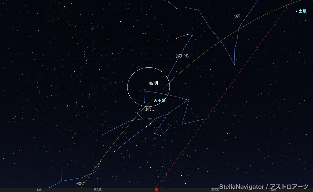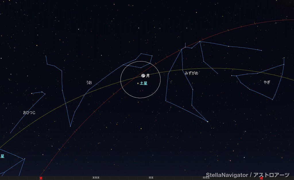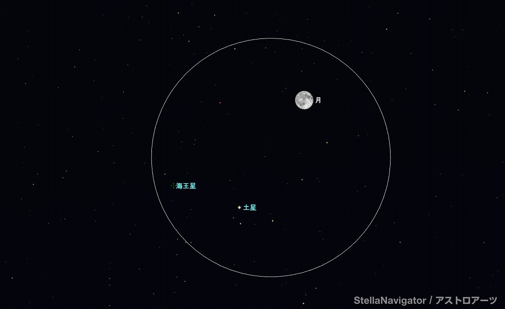 ![]() 2025年9月9日22時ごろの南東の空。 黄線:黄道、赤線:天の赤道 (月齢16.3) ![]() 満月と土星、そして、海王星(7.8等級) (視野円7度) ![]() 2025年9月12日深夜24時ごろの東の空。 黄線:黄道、赤線:天の赤道 (月齢20.4) ![]() 月とすばる(プレアデス星団) (視野円7度) ![]() 満月と土星、そして、天王星(5.7等級) (視野円10度) |