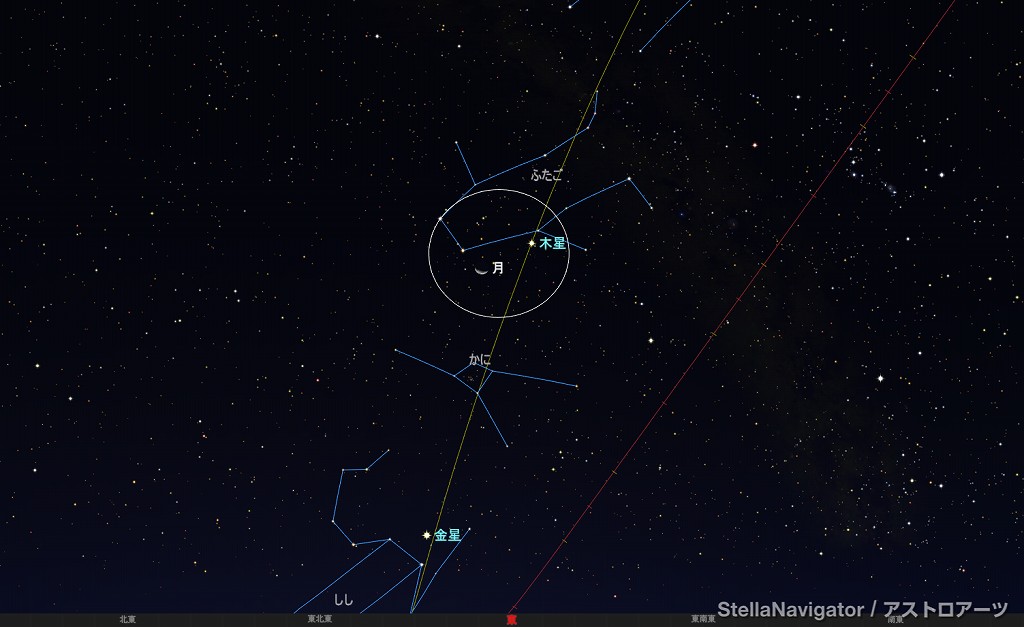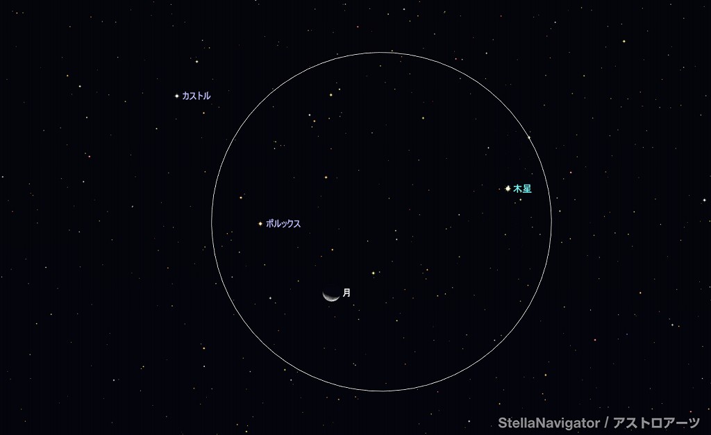 ![]() 2025年9月17日早朝4時ごろの東の空。 黄線:黄道、赤線:天の赤道 (月齢24.5) ![]() 月、木星、カストル、ポルックス (視野円10度) |