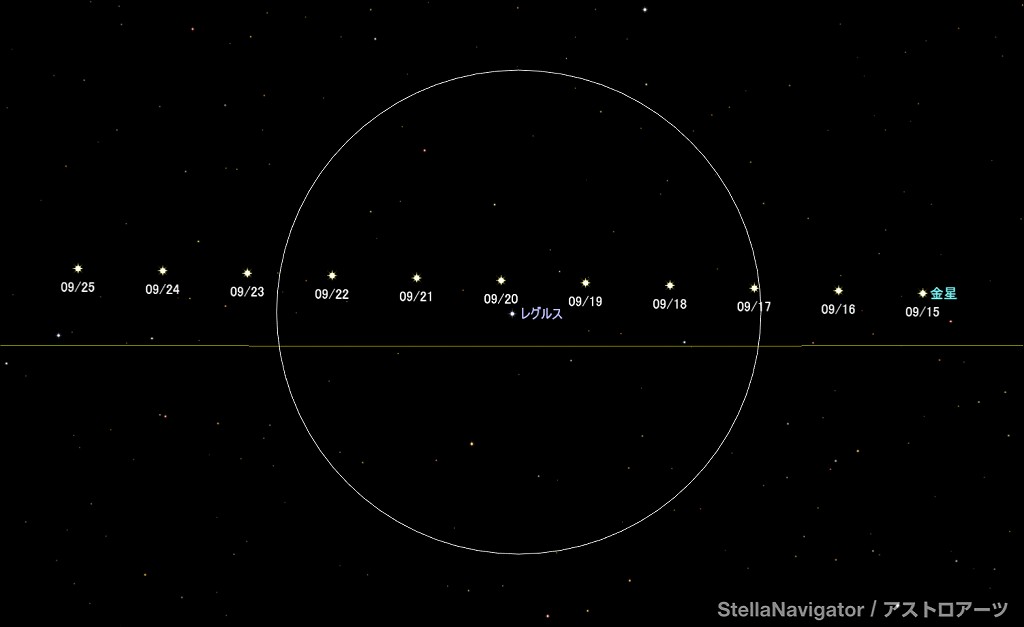 ![]() 2025年9月20日早朝4時半ごろの東の空。 金星とレグルスが超接近。 ![]() 金星とレグルスは約0.5度まで接近。 近くには、新月間近の細〜い月。 ![]() 金星の移動の様子(9月15日〜25日)。 黄線は黄道。 (視野円7度) |