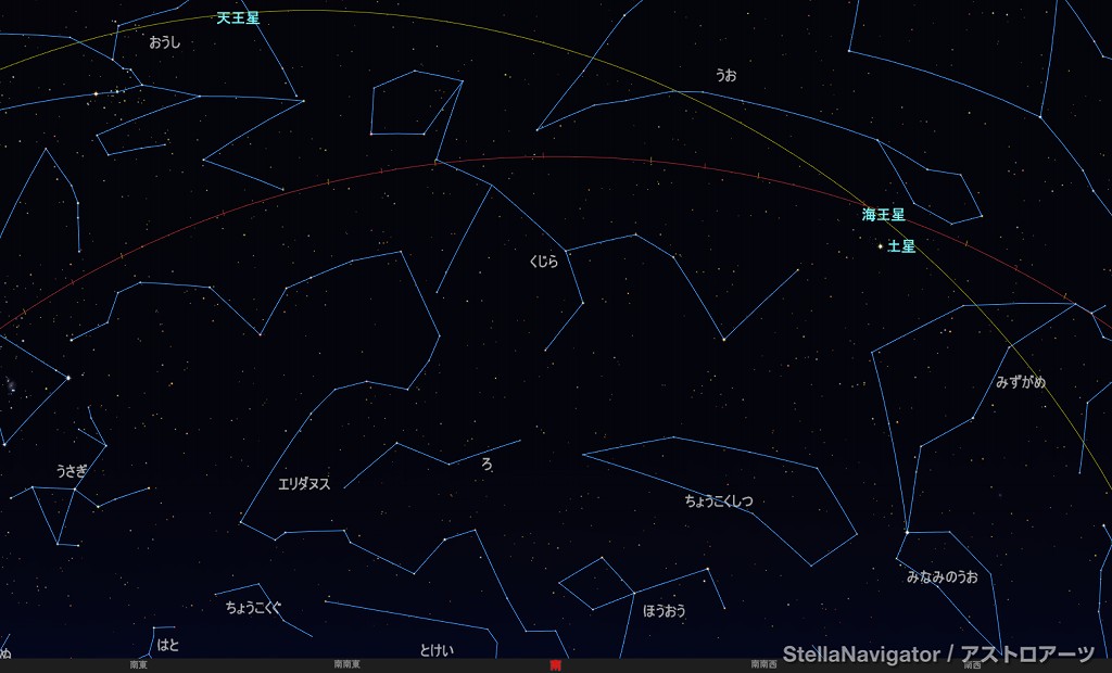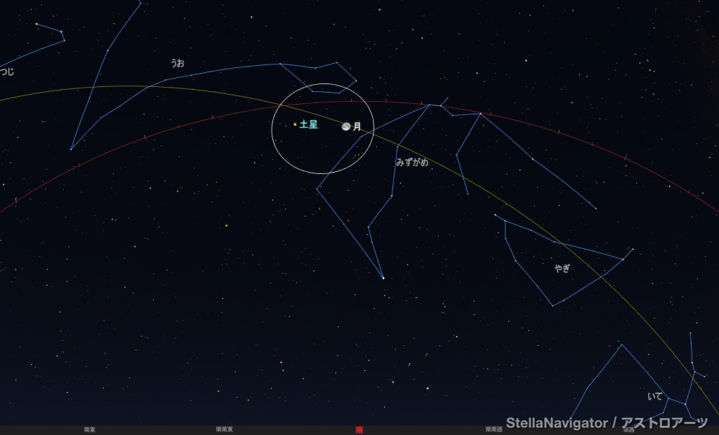 ![]() 2025年10月5日22時ごろの南の空。 黄線:黄道、赤線:天の赤道 (月齢13.7) ![]() 月と土星 (視野円10度) |