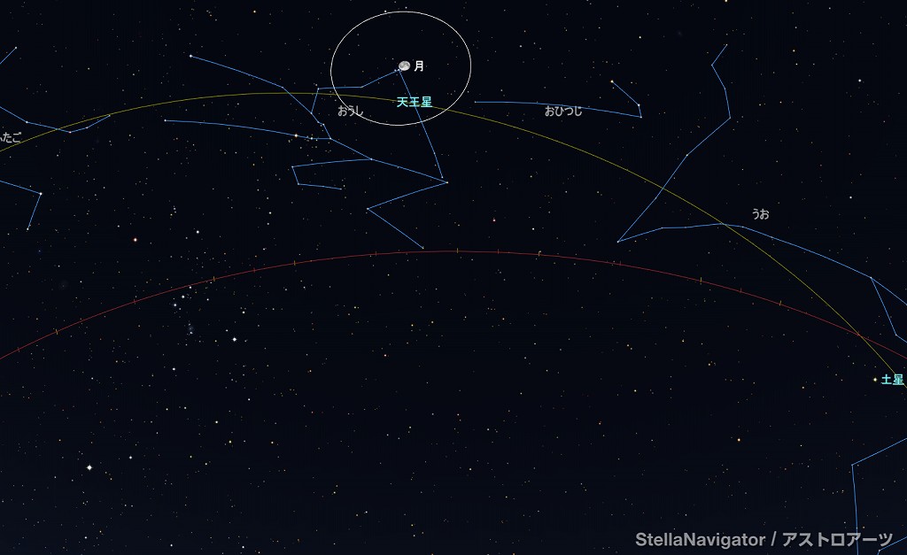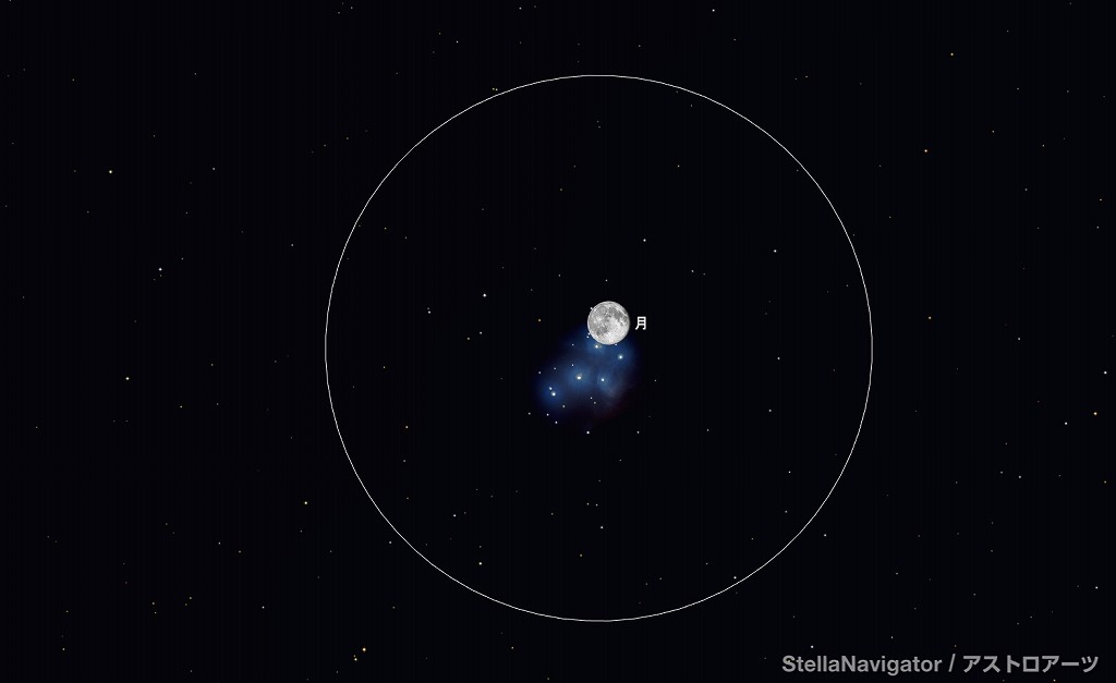 ![]() 2025年11月6日24時(7日0時)ごろの南の空。 黄線:黄道、赤線:天の赤道 (月齢16.1) ![]() 月がすばるを隠す「すばる食」 (視野円7度) |