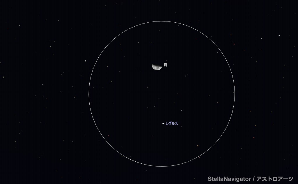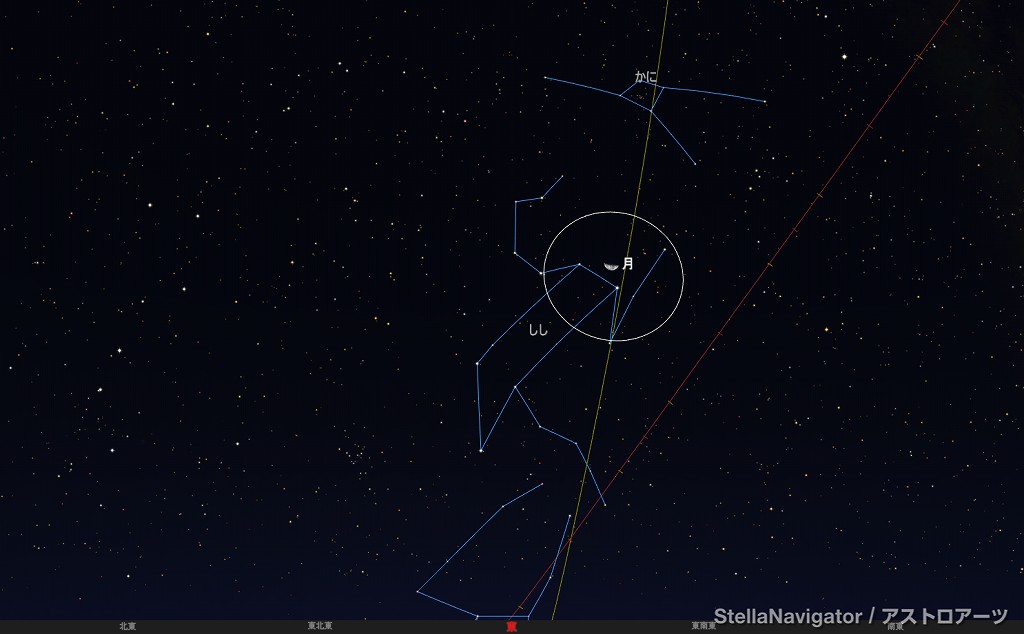 ![]() 2025年11月13日未明3時ごろの東の空。 黄線:黄道、赤線:天の赤道 (月齢22.2) ![]() 月とレグルス (視野円7度) ![]() 2025年11月17日早朝5時ごろの東の空。 黄線:黄道、赤線:天の赤道 (月齢26.3) ![]() 月とスピカ (視野円7度) |