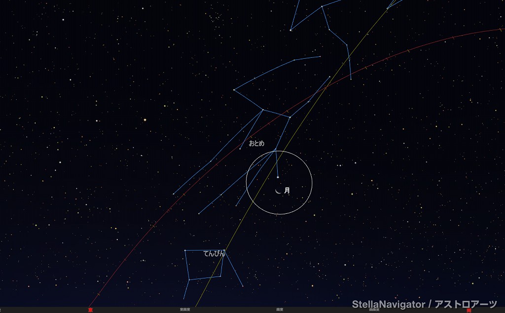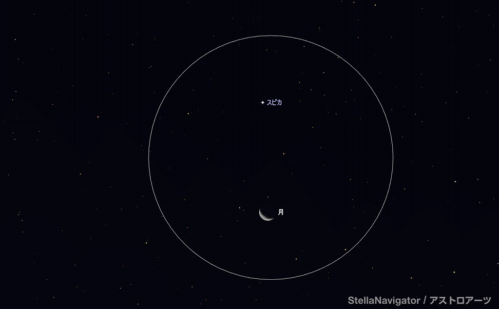 ![]() 2025年12月11日未明3時ごろの南東の空。 黄線:黄道、赤線:天の赤道 (月齢20.5) ![]() 月とレグルス (視野円7度) ![]() 2025年12月15日早朝5時ごろの南東の空。 黄線:黄道、赤線:天の赤道 (月齢24.5) ![]() 月とスピカ (視野円7度) |